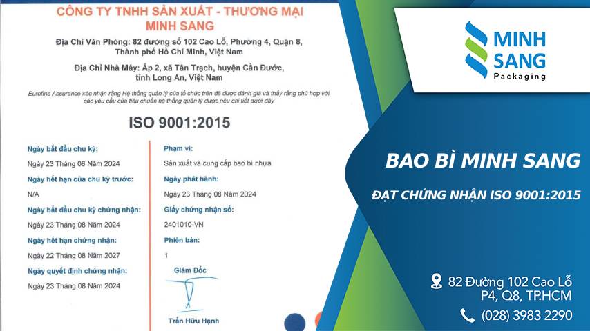 Với danh mục sản phẩm đa dạng và chất lượng vượt trội, Minh Sang đã và đang khẳng định vị thế của mình trên thị trường bao bì trong và ngoài nước. Sự cam kết không ngừng cải tiến chất lượng và dịch vụ, cùng với việc đạt được các chứng nhận quốc tế như ISO 9001:2015, đã giúp Minh Sang trở thành đối tác tin cậy của nhiều doanh nghiệp lớn. Minh Sang không chỉ cung cấp sản phẩm mà còn mang đến giải pháp bao bì toàn diện, đồng hành cùng khách hàng trong việc bảo vệ môi trường và phát triển bền vững. Minh Sang tiếp tục nỗ lực để đáp ứng ngày càng tốt hơn nhu cầu của thị trường và tạo ra giá trị lâu dài cho khách hàng và cộng đồng.